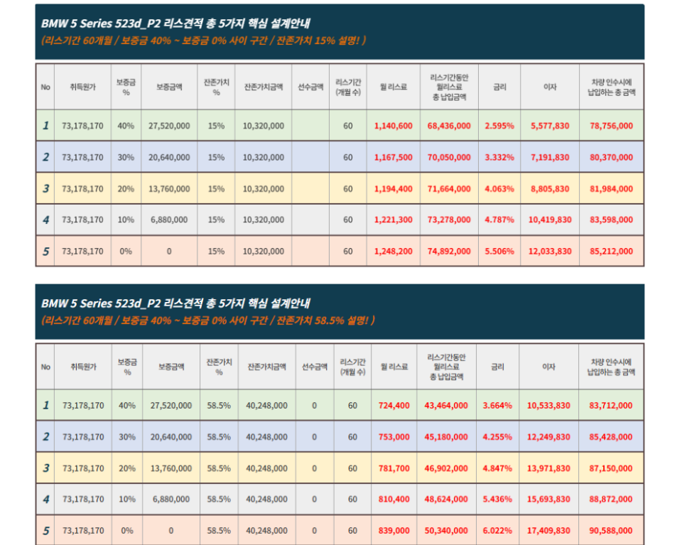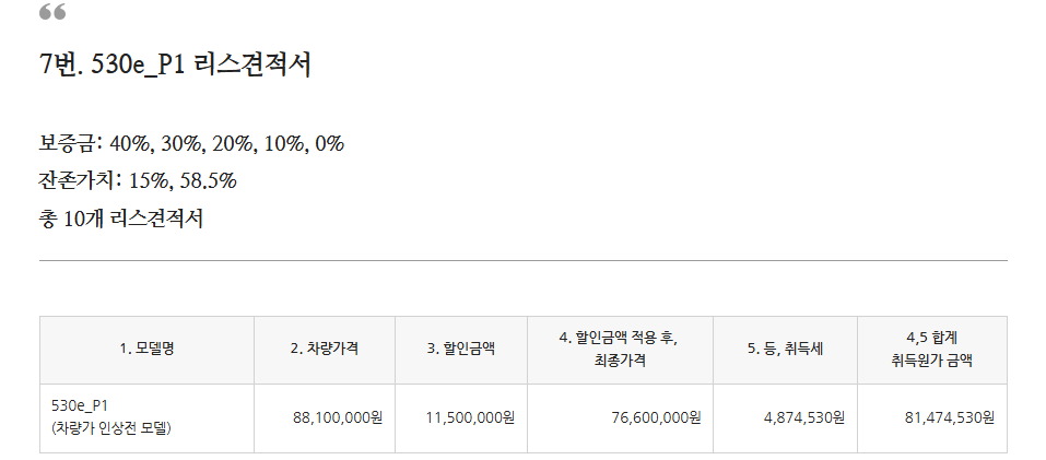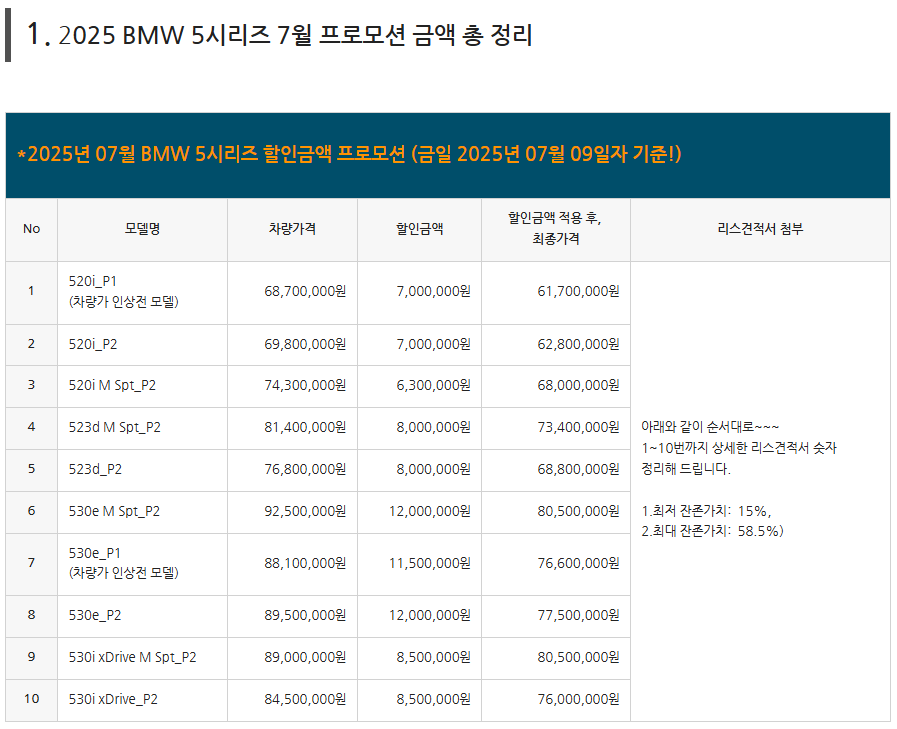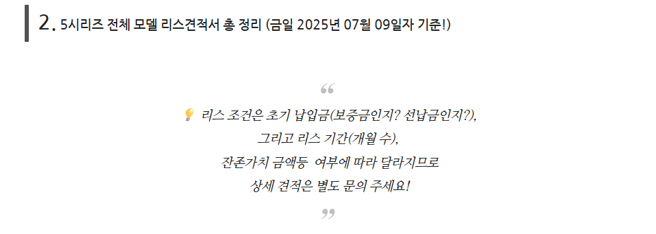 BMW 5시리즈 전체 모델 2025년 7월 최대할인 금액과 리스견적서 상세 정리